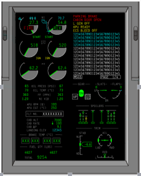 發參仿真顯示器為試驗座艙中重要顯示設備。主要顯示發動機指示和機組警告信息,包括指示飛機各系統工作狀態,提供文字、圖形、音頻信息,出現故障時提示故障和發出警告。主/次發動機參數及襟翼位置、燃油量、起落架位置警告信息顯示狀態頁各個系統頁維護頁信息